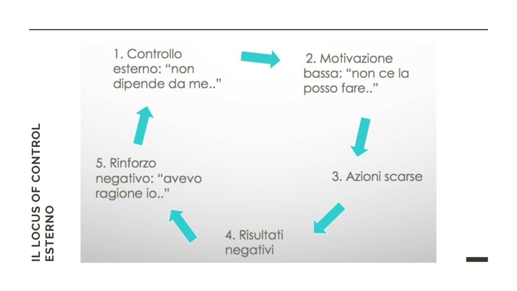Il LOCUS OF CONTROL ESTERNO non permette di agire ed esprime l’atteggiamento passivo di lasciare la responsabilità di quello che ci succede all’esterno e alle altre persone.