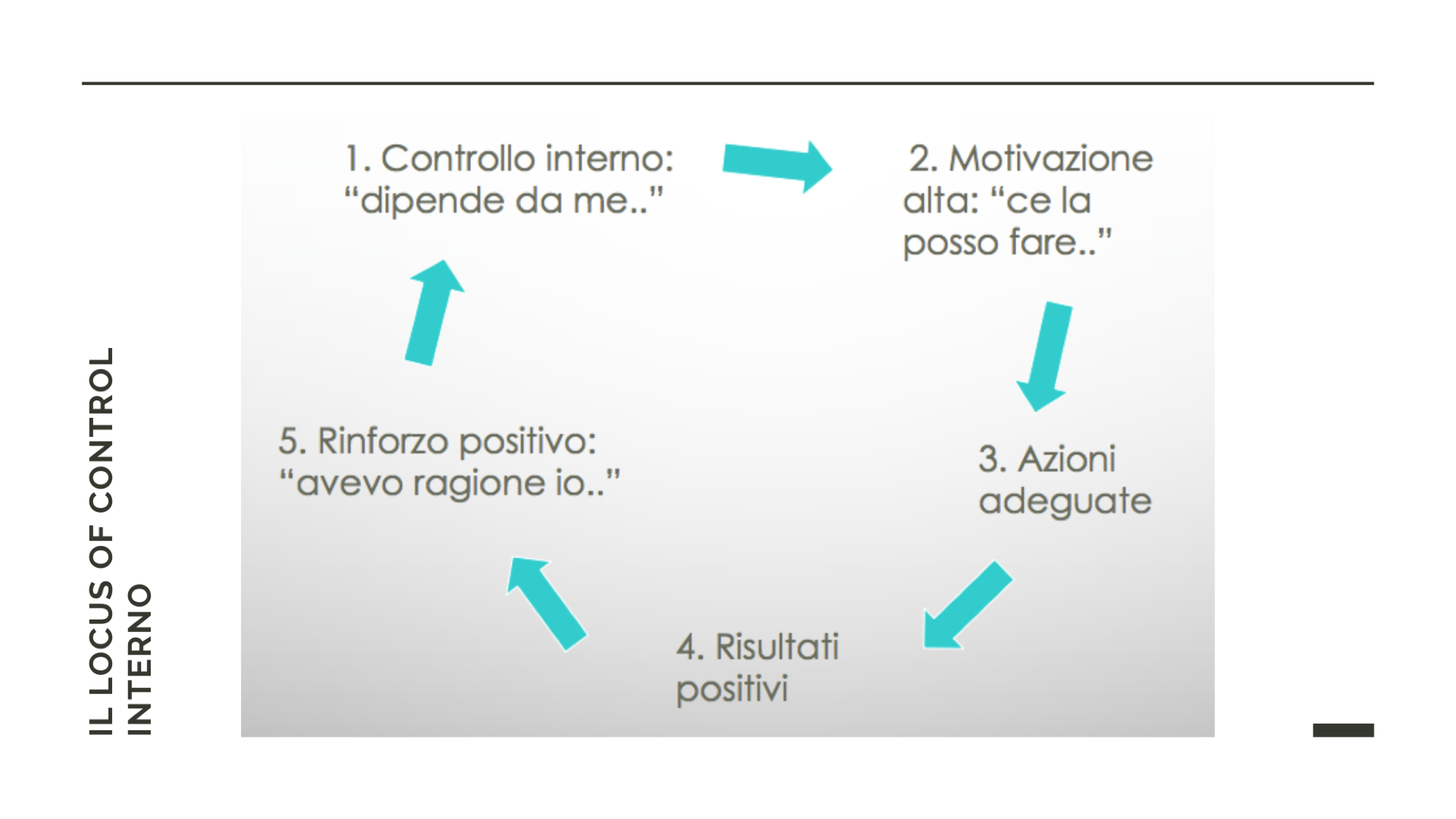 Al contrario, con il LOCUS OF CONTROL INTERNO posso prendere in mano la situazione, mi assumo la responsabilità in prima persona e mi sento causa attiva di ciò che mi succede.