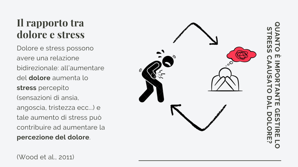 Esiste un circolo vizioso tra dolore e stress: la percezione del dolore provoca stress ed essa incrementa all’aumentare dell’altro stabilendo, spesso, un circuito che si autoalimenta. Il ruolo della psicologia nel dolore, e specialmente in quello che definiamo come dolore cronico o persistente, è quello di andare a lavorare sugli aspetti psicologici che possono aiutare a ridurre lo stress e, quindi, il precedente citato circolo vizioso Stress–Dolore.